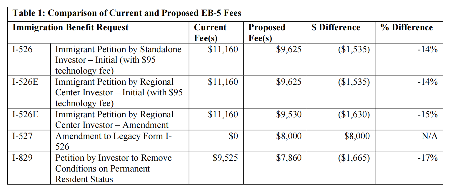 • I-526/I-526E:从11,160美元下降至9,625美元,降幅14%;